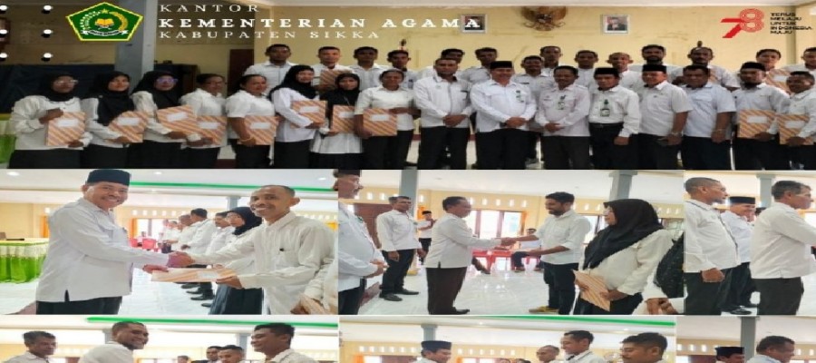 Kepala Kantor Kementerian Agama Kabupeten Sikka, Yosef Rangga Kapodo, Senin 29 Agustus 2023 bersama Pejabat Eselon IV Lingkup Kantor Kementerian Agama Kabupaten Sikka menyerahkan Surat Keputusan PPK kepada 28 PPPK Kementerian Agama Kabupaten Sikka yang dilantik pada tanggal 15 Agustus 2023 oleh Menteri Agama, bertempat di Aula Kantor Kementerian Agama Kabupaten Sikka.